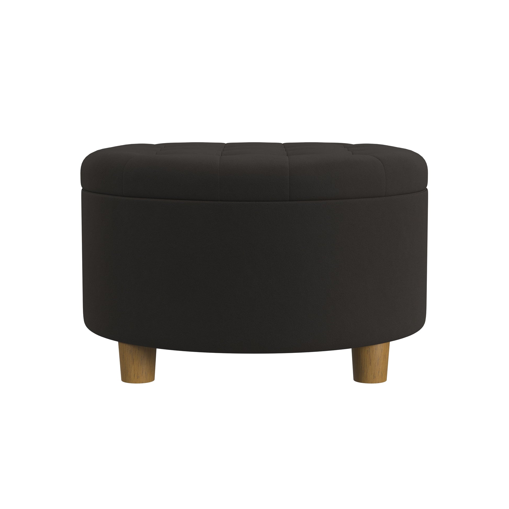 Our large round ottoman offers interest, seating and a stylish storage solution for everything from blankets to toys. With a button tufted lift off lid this modern ottoman has a relaxed, organic feel. Enjoy in your living room as a pair or in front of an accent chair for a comfortable seating arrangement. This storage ottoman with a lift off top and dark walnut finished legs is easy to assemble and maintain.