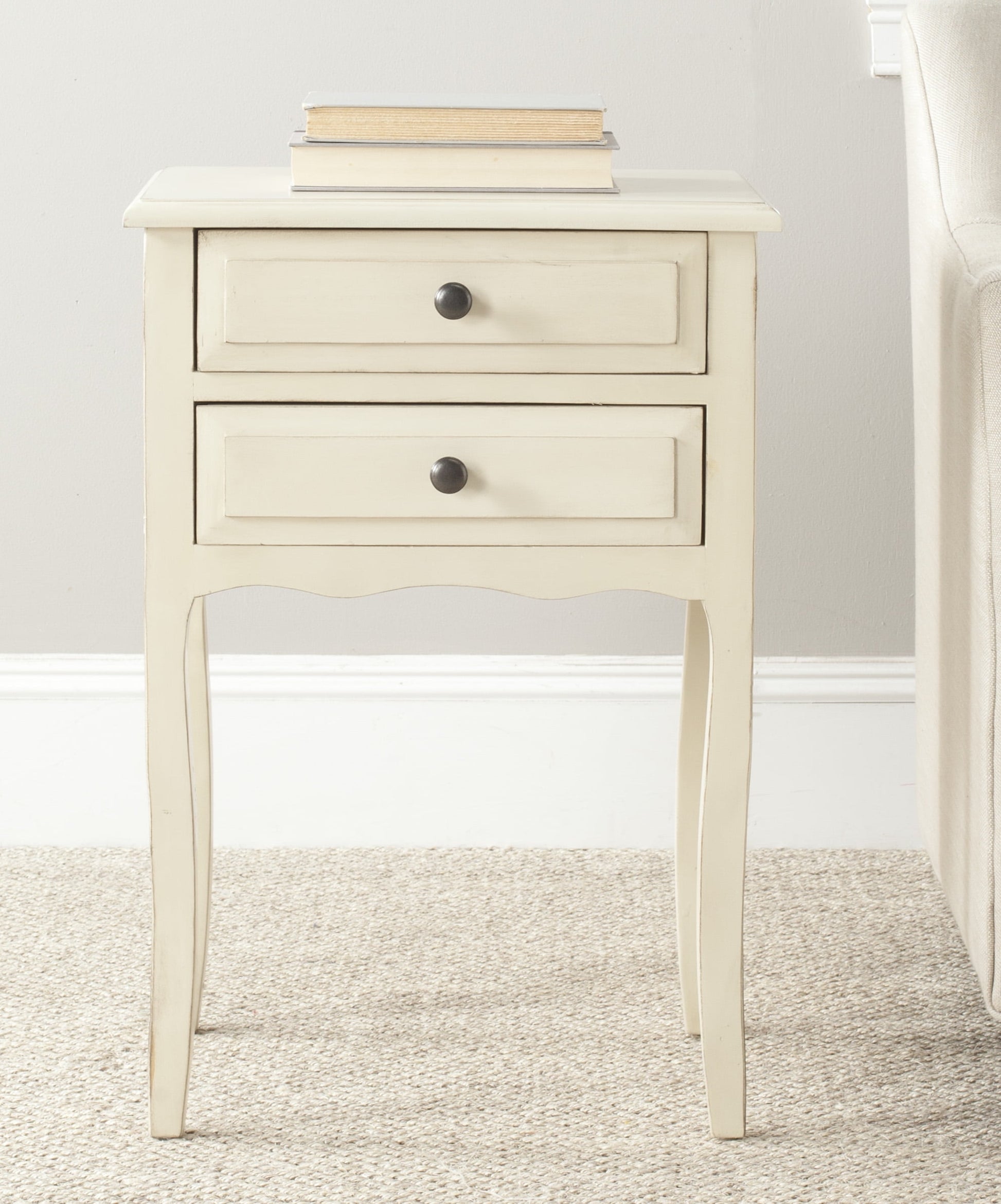The gently scalloped apron and subtle cabriole legs of this Lori End Table bring perfect French farmhouse charm to any decor. Graceful and feminine, Lori's elm wood frame and ash grey finish give it the appearance of a well loved heirloom, lending Lori a warm, classic ambiance. Two drawers provide discreet storage.For over 100 years, SAFAVIEH has set the standard for finely crafted rugs and home furnishings. Begin your rug, furniture, lighting, outdoor, and home decor search and discover over 100,000 SAFAVIEH products today.