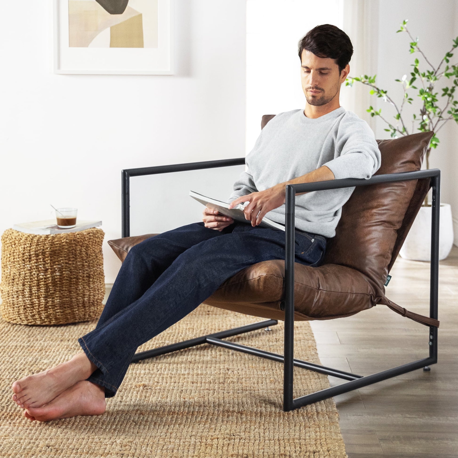 - SLEEK AND CHIC – With its relaxed silhouette, next-level comfort, and an upgraded new look, the Aidan Sling Chair with vegan faux leather cushions is sure to make quite the statement in your living space or office space